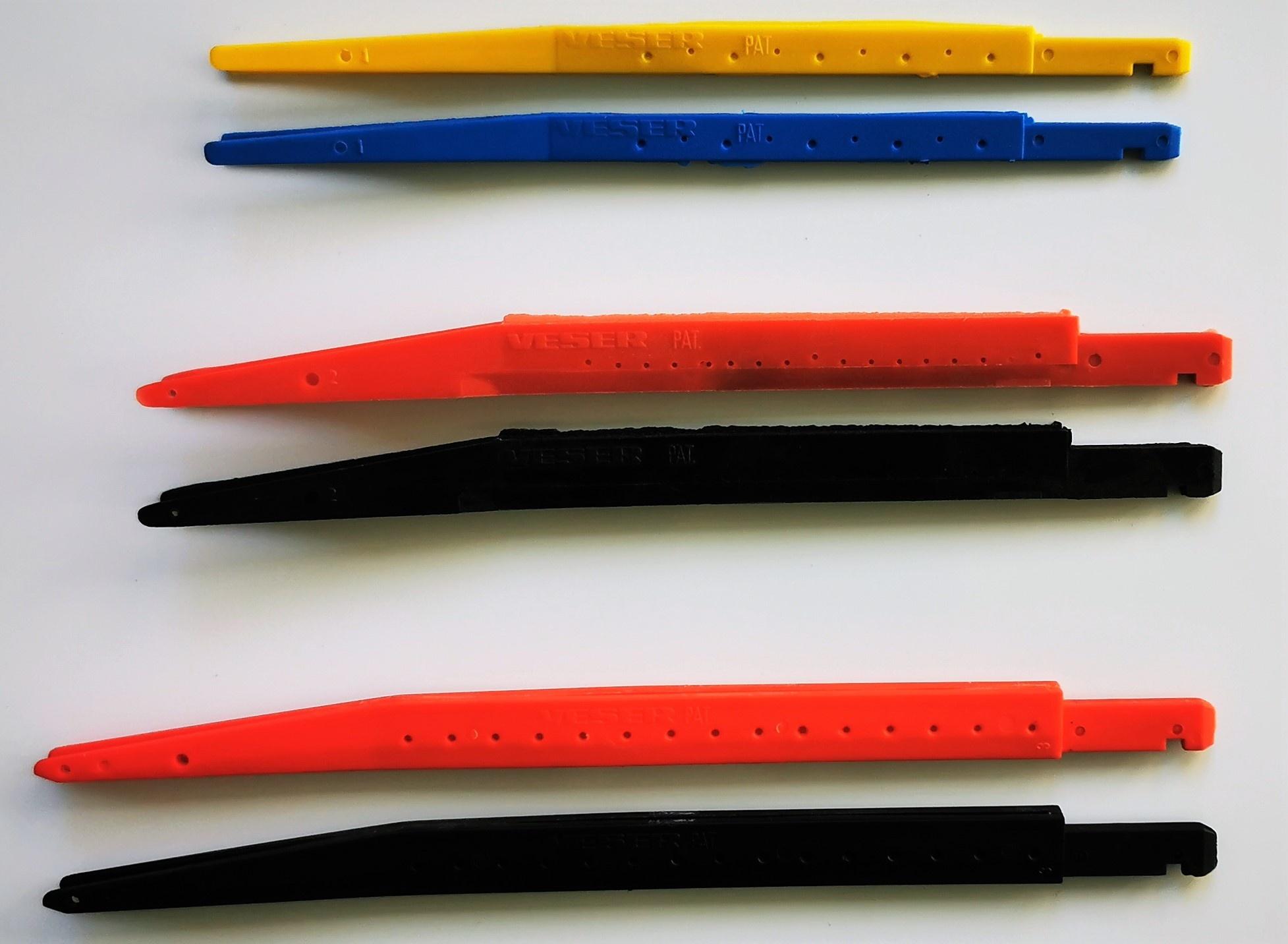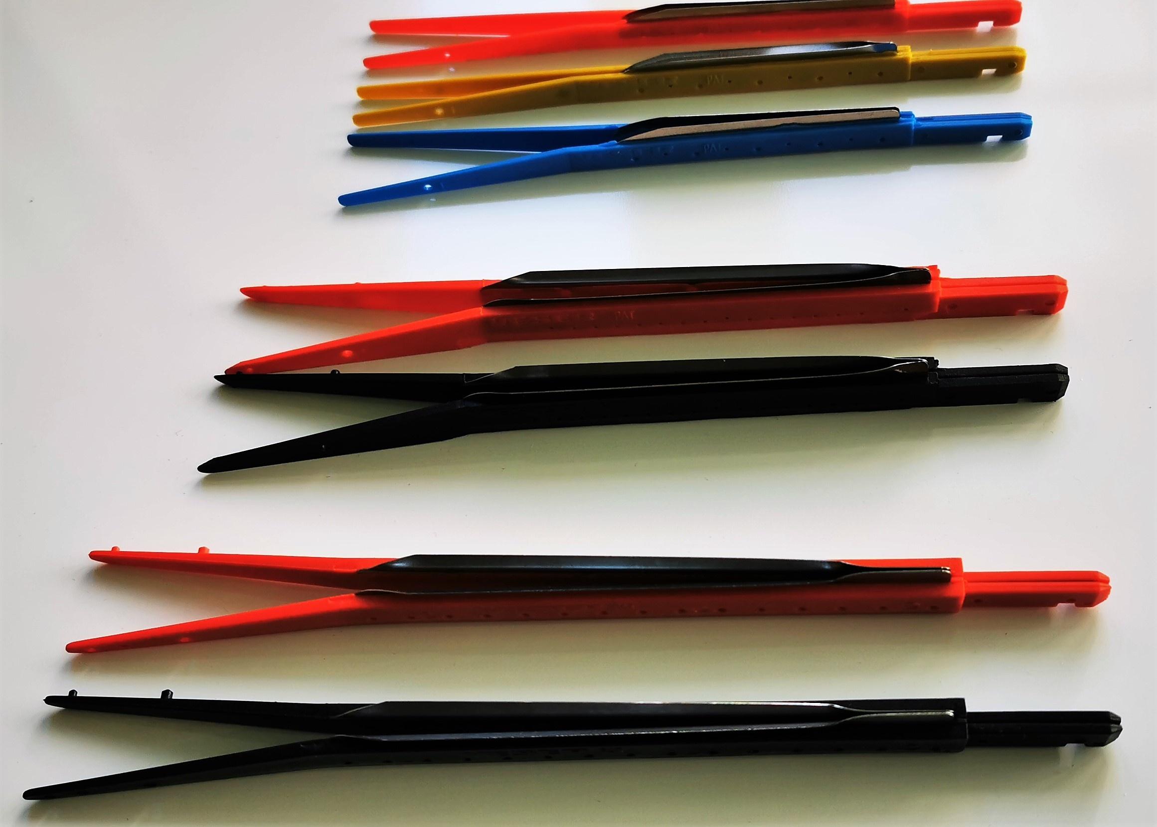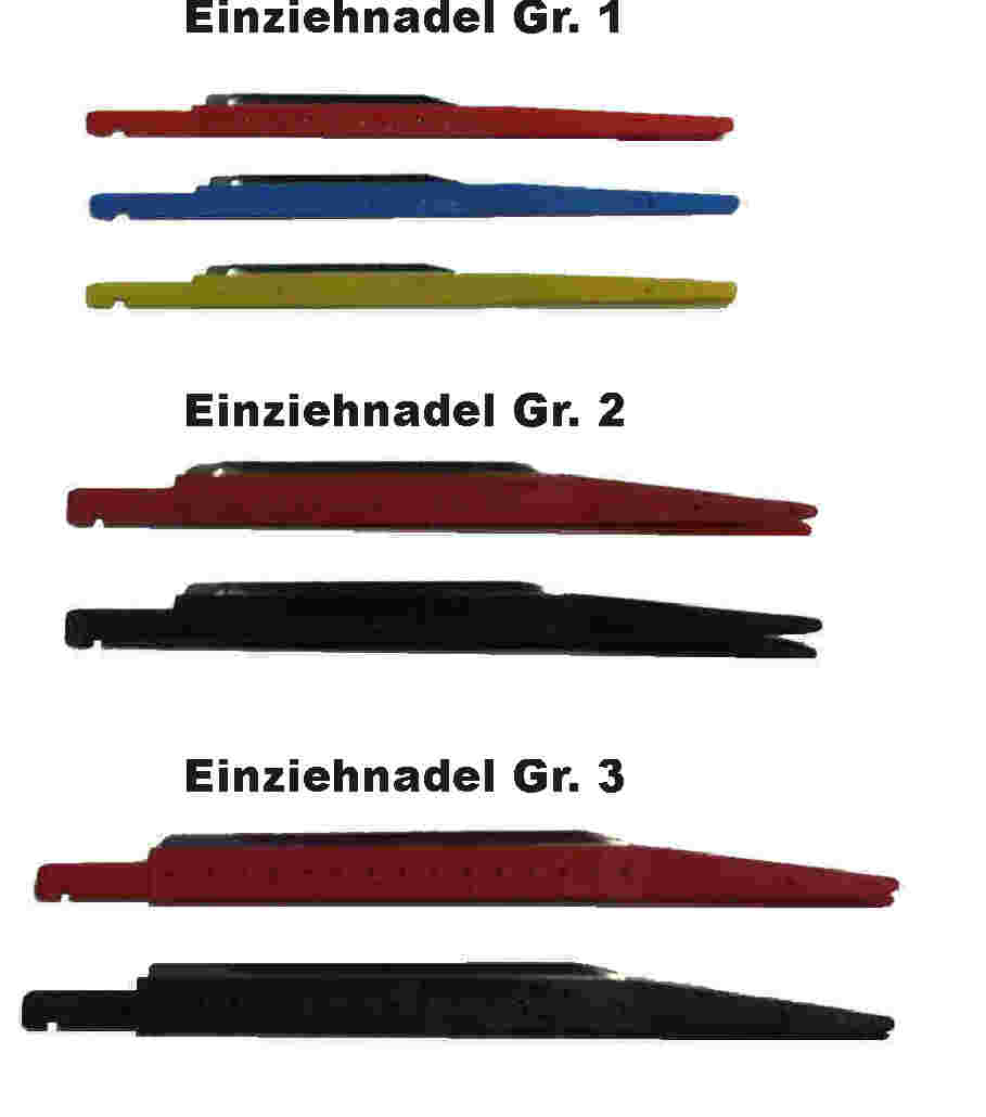 Das Trägermaterial der Einziehnadel ist aus GFK. Die Lippe ist aus gehärtetem Stahl, um den Verschleiß so gering wie möglich zu halten. Der Vorteil dieser Einziehnadel liegt in der Flexibilität, damit können auch geschränkte Statoren eingezogen werden. Die Einziehnadel ist zweigeteilt und kann einzeln nachbestellt werde