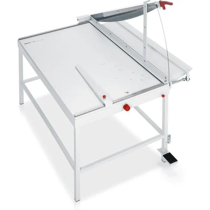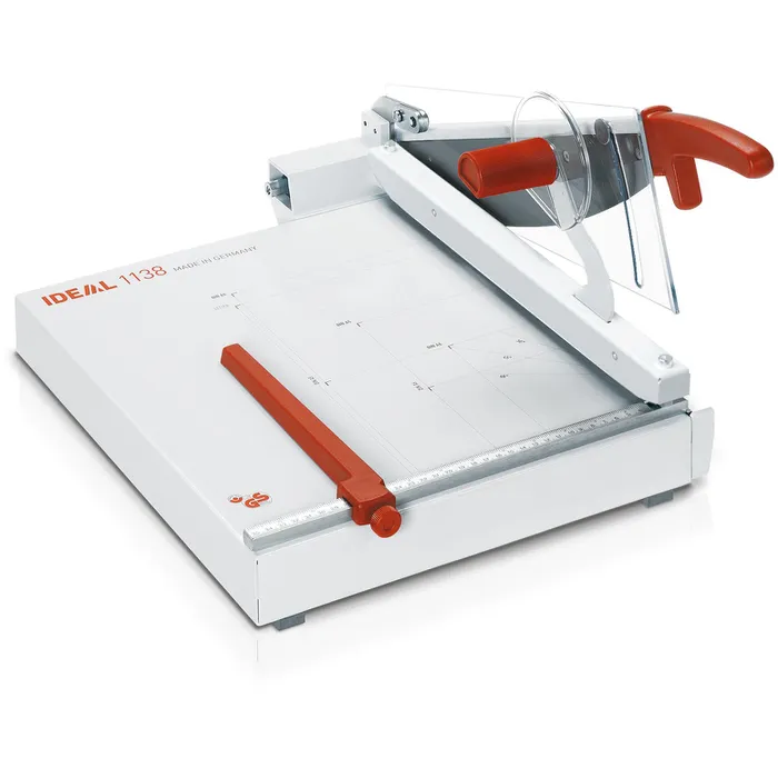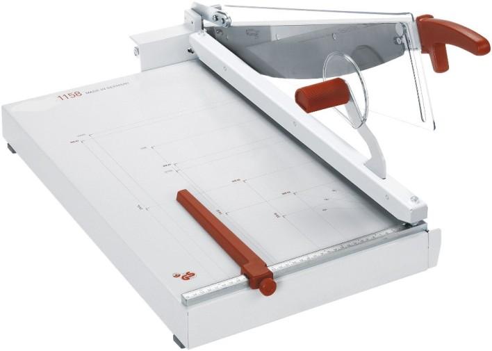 Die Papierschneidemaschine ist eine robuste Ganzmetall- Konstruktionen. Die Messer aus Solinger Stahl sind nachschleifbar. Das Untergestell ist serienmäßig und hat auf der rechten Seite einen abklappbaren Seitentisch. Das Material wird mittels Fußpedalpressung gehalten. Der Rückanschlag ist stufenlos verstellbar. Der Vorderanschlag, der mit einer Schmalschnitteinrichtung ausgestattet ist, wird mittels Drehknopf ausgefahren. Der feststehende Handschutz ist aus bruchsicherem Plexiglas.